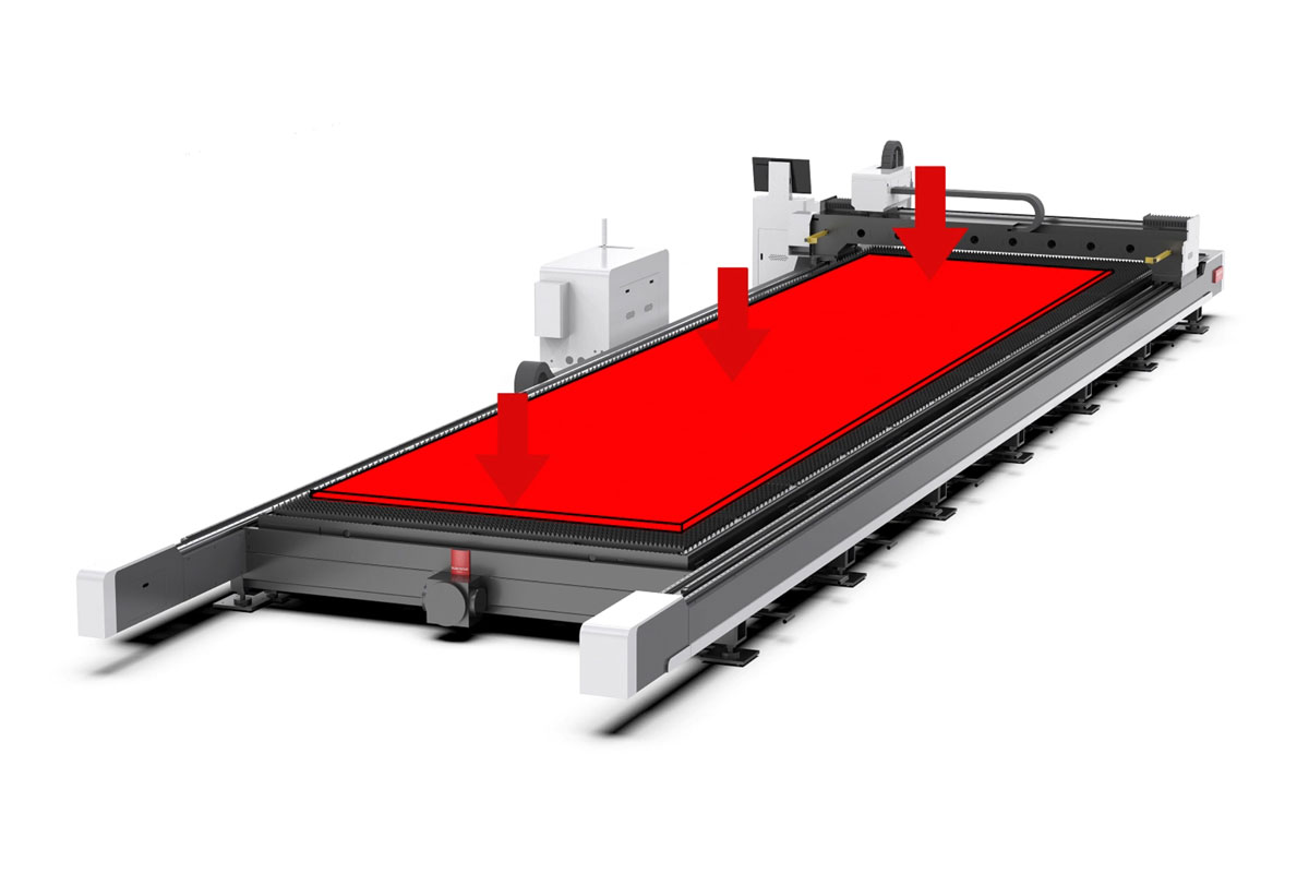 针对船舶行业厚板比例高、单张板材重量大、切割图形复杂且连续作业强度高的加工特点,力星激光采用工作台与床身分离式结构设计,有效隔离钢板重量及高功率切割产生的热影响,避免热应力和载荷直接作用于床身结构,从源头上保障机床长期稳定运行与精度保持。